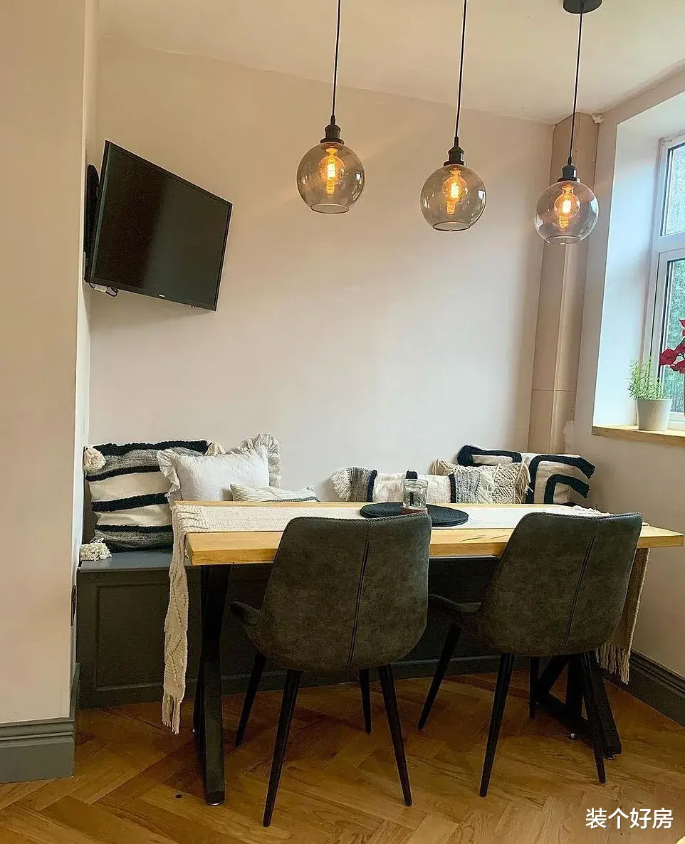 于是布兰妮利用原本荒废的窗边,先花60英镑改造卡座区,收获了额外的收纳空间。再用木材和桌腿拼接,刷上油漆、打上蜡,仅花90英镑就get了一款Esty上售价超过300英镑的同款餐桌。