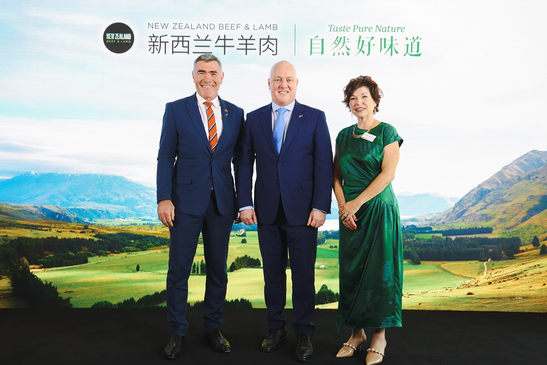 新西兰总理克里斯托弗・拉克森阁下(中)、新西兰肉类行业协会(MIA)独立主席内森・盖伊(左)、MIA首席执行官西尔玛・卡拉配娃(Sirma Karapeeva,右)共同见证"Taste Pure Nature"焕新标识