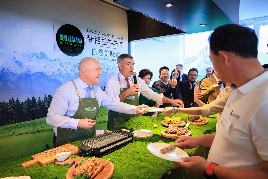 新西兰总理克里斯托弗・拉克森阁下与MIA独立主席内森・盖伊、MIA首席执行官西尔玛・卡拉佩娃亲临烹饪展台,为新西兰草饲羊肉串添加特制香料,并向中方合作伙伴代表赠餐。