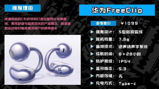 华为FreeClip凭借创新的C形桥架构打造出差异化竞争路线,秉持舒适与音质双优的产品理念,精准适配运动爱好者和潮流用户的使用需求。