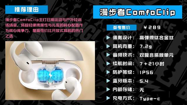 漫步者ComfoClip主打日常运动与户外轻训练场景,将超轻便携属性与扎实的核心配置作为核心竞争力,是高性价比开放式耳机的热门之选。