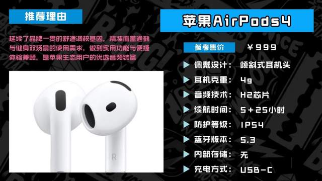 苹果AirPods4延续了品牌一贯的舒适调校基因,精准覆盖通勤与健身双场景的使用需求,做到实用功能与便捷体验兼顾,是苹果生态用户的优选音频装备。