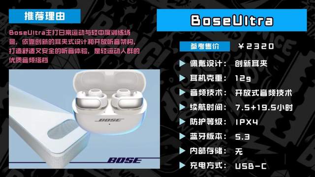 BoseUltra主打日常运动与轻中度训练场景,依靠创新的耳夹式设计和开放听音架构,打造舒适又安全的听音体验,是轻运动人群的优质音频搭档。