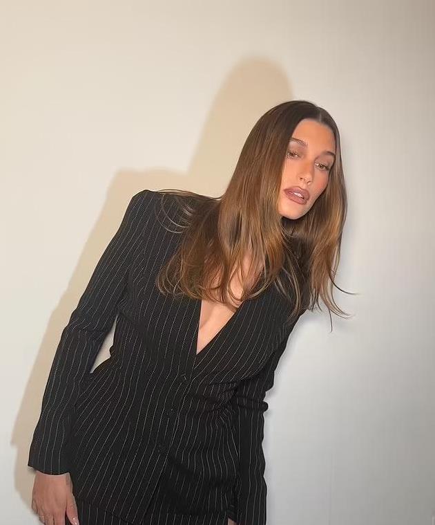 当天早些时候,海莉在Instagram上发布了引人遐想的照片合集。她不仅分享了几张自己身穿无衬衫条纹西装的性感大片,还在其中插入了一句耐人寻味的励志语录:“我不完美。我曾被拒绝。但我仍有我的意义。”