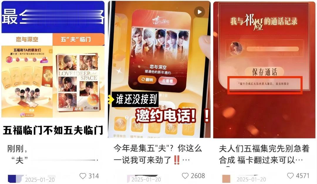 比如去年用户翻转《恋与深空》福卡后,大概率会触发男主的邀约语音电话彩蛋,聆听来自男主的新春爱意;