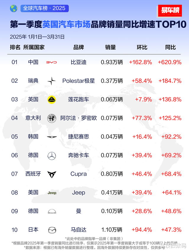 而在英国市场,比亚迪发展同样迅猛。2025年一季度销量达到0.93万台,同比增长超620%,超越2024全年销量,成为英国销量增长最快的汽车品牌。比亚迪宋Plus DM-i亦荣膺该国3月最畅销插混车型。目前,比亚迪已在伯明翰、曼彻斯特、格拉斯哥等城市开设门店,在售车型包括元PLUS、海豚、海豹、海狮07、宋Plus等。