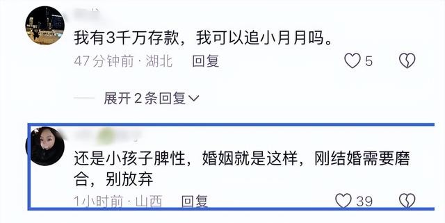 甚至还有网友表示,让小月月赶紧生个孩子稳固地位。