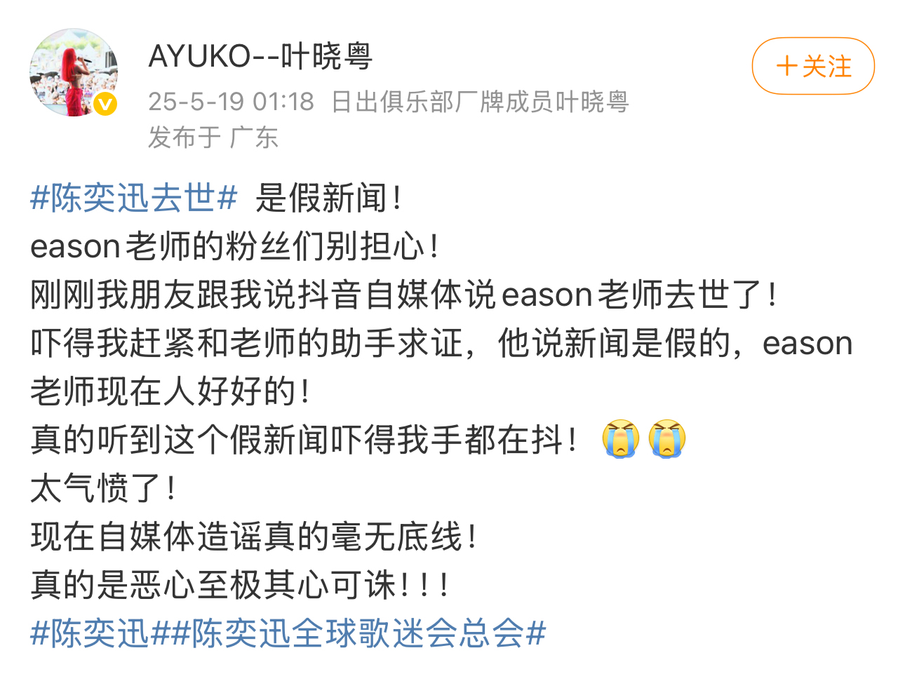 5月19日凌晨1时18分,歌手叶晓粤(曾为陈奕迅战队学员)通过微博实名认证账号发布声明:“已通过微信直接联系陈奕迅助手核实,Eason老师目前身体状况良好,相关消息纯属捏造。” 她特别强调,出于隐私保护原则不便公开聊天记录,但保证信息绝对可靠。随后在评论区补充说明:“是直接与工作团队取得联系,绝非道听途说。”