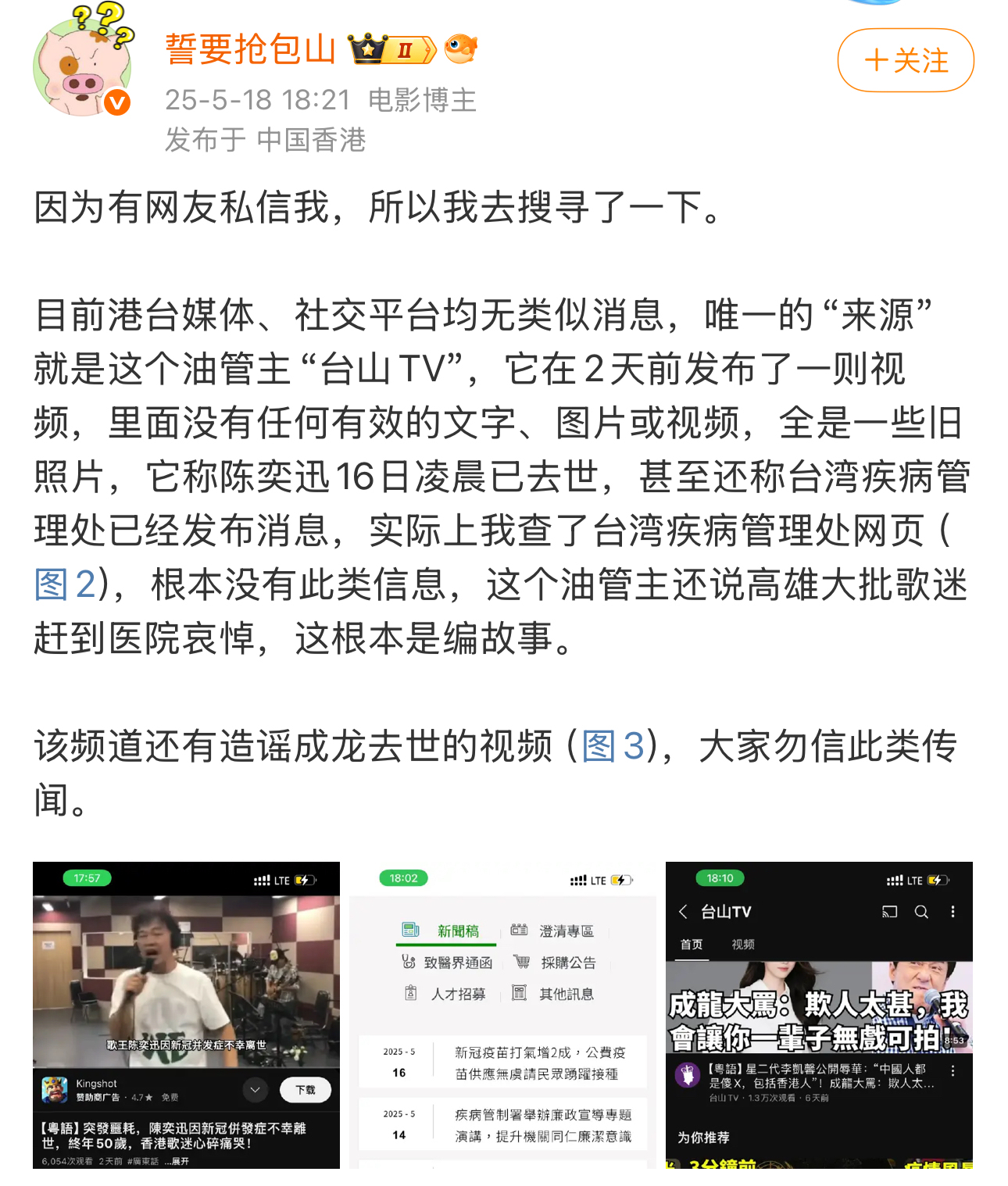 拥有34.7万粉丝的香港电影博主 “誓要抢包山” 于18日18时21分发布核查报告:“经全面检索港台主流媒体及社交平台,均未发现任何相关报道。唯一信息源‘台山 TV’发布的视频内容完全缺乏事实依据,且该账号曾多次造谣成龙去世等事件。” 他特别指出,所谓 “台湾疾病管理处已发布消息” 纯属子虚乌有,官方网站无任何相关记录。