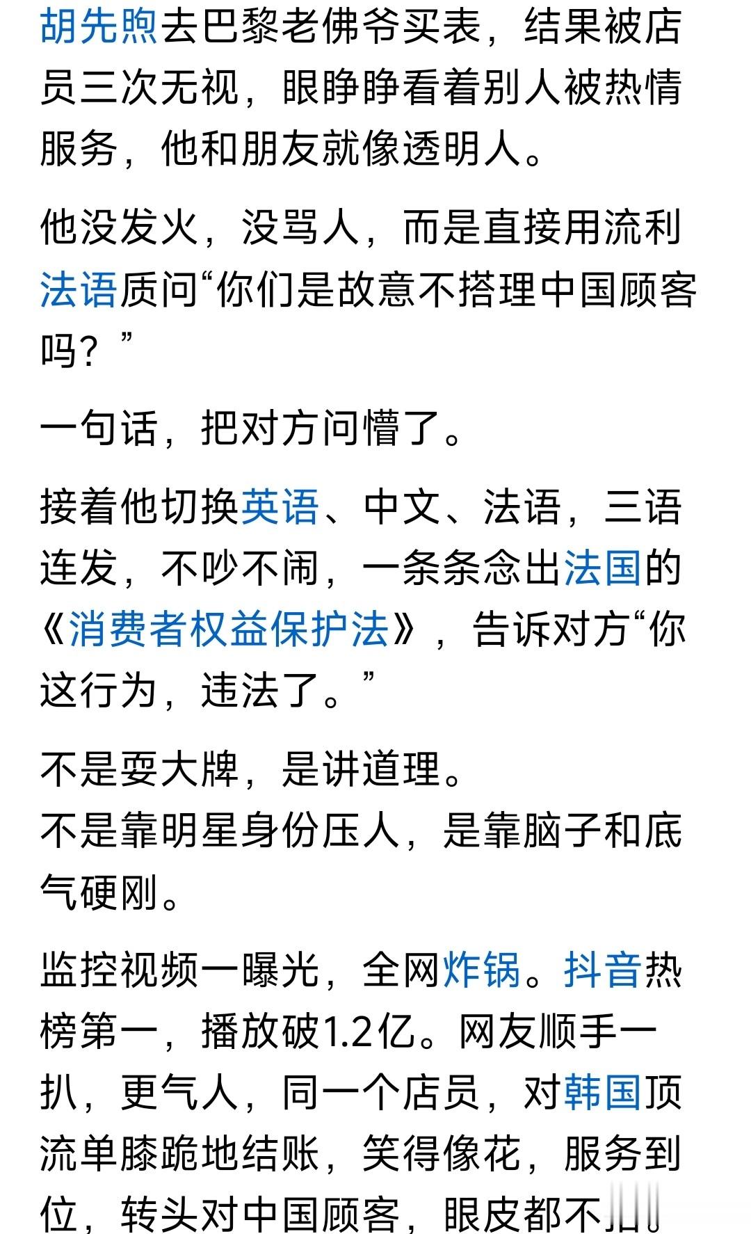 胡先煦在国外买表被店员无视的视频一出,立即播放量过亿,令人感到震惊的不是店员无视无礼的态度,而是胡先煦居然会用法语,英语,中文三国语言流利切换质问店员。