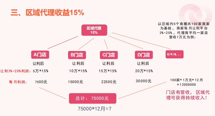 为满足部分拥有闲置资金、希望实现“躺赚”愿望的投资者需求,“我店”还设立了区域代理板块。通过省代、市代和区代的地理区域划分,采用共享股东模式,降低投资风险,提供充足的周转资金,加速平台发展。