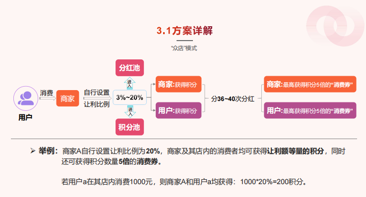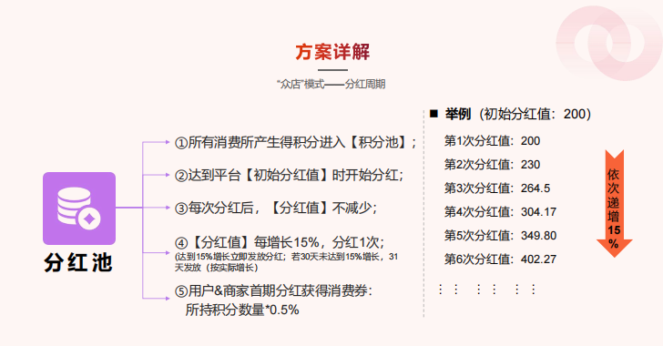 此时让利部分的利润进入奖金池,积分则进入积分池。积分经过36到40期进行增值,经过独特的AI算法,积分最终可换算成让利额最高的五倍消费券,可用于后续的消费抵扣。