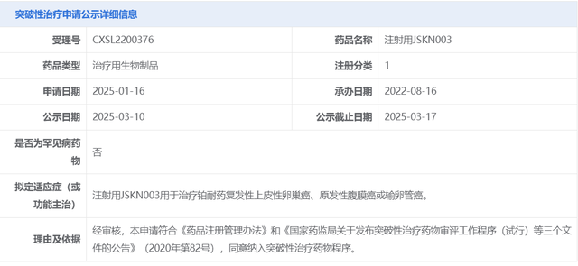 近日,注射用JSKN003拟纳入突破性治疗,用于治疗铂耐药复发性上皮性卵巢癌、原发性腹膜癌或输卵管癌。