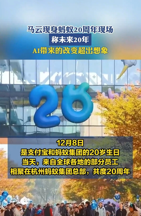 2024 年 12 月 8 日,支付宝和蚂蚁集团迎来 20 岁生日,久未公开露面的马云现身蚂蚁园区。