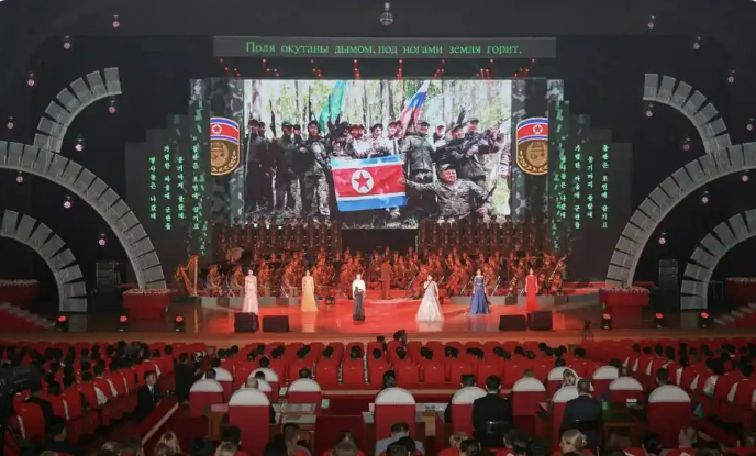 据参考消息网援引新加坡《联合早报》网站报道,朝鲜国营电视台近日播放了在平壤举行的朝俄文艺晚会。舞台背景屏幕播放了一系列照片,显示一排共六具棺木,而朝鲜最高领导人俯身在其中一具棺木前,为其盖上国旗,并轻抚棺木,神情哀伤。报道称,画面中还出现朝鲜和俄罗斯士兵挥舞国旗,旗帜上用朝鲜语写着爱国口号。朝鲜最高领导人在晚会上看到这一幕时似乎深受触动,也有许多观众拭泪。据朝中社报道,这场演出获得热烈反响,凸显“两国军民之间用鲜血铸就的友谊纽带和真诚的国际义务”。