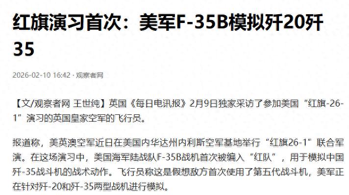 近日《观察者》报道,据英国《每日电讯报》、英国《太阳报》等诸多外媒报道称,在美国内华达州内利斯空军基地举行,2026年2月2日至2月13日开展的,美英澳红旗-26-1三国联合军演中,美国海军陆战队F-35B战机首次被编入红方,用于模拟中国隐身战斗机,本次军演也是美国假想敌方首次使用第五代战斗机,美英澳正在训练如何对付对手的隐身机。