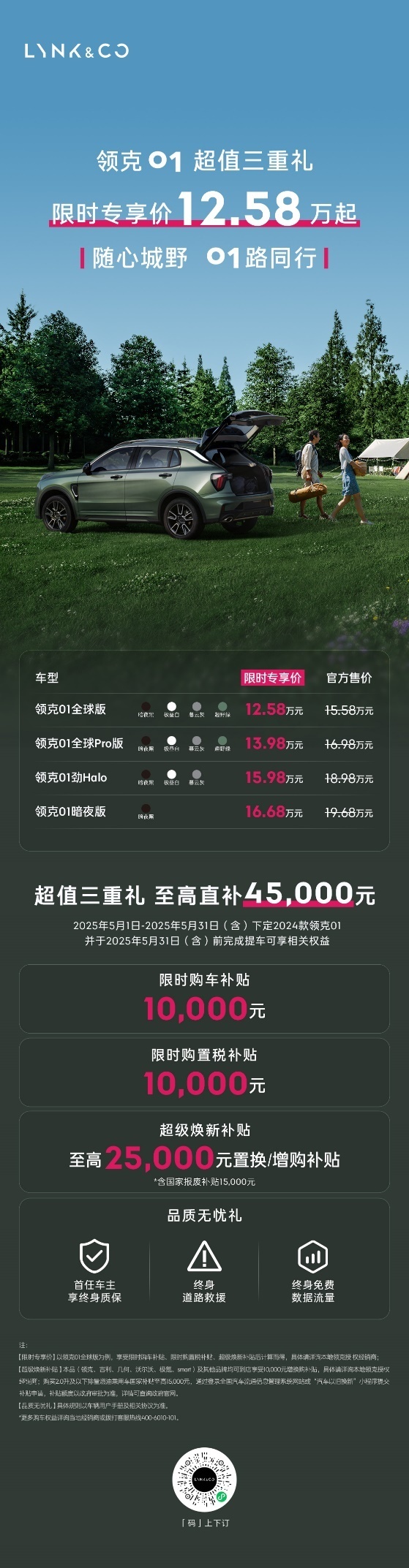 这个五月,是拥抱品质出行的绝佳时机。领克01限时专享价12.58万元起,更有超值三重礼等你来拿。10000元限时购车补贴、10000元购置税补贴,直接减轻购车负担;超级焕新补贴10000元还可与国补15000元叠加使用,至高可享45000元综合购车权益。别再犹豫,抓住机会,让领克01成为你探索世界的可靠伙伴,开启每一段精彩旅程!