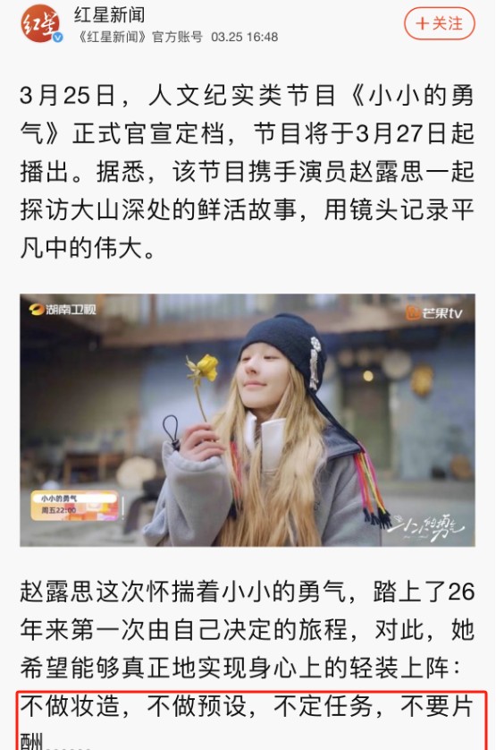 据红星新闻报道,赵露思这档真人秀综艺,没有妆造、没有剧本、没有任务、没有片酬,随心出发。