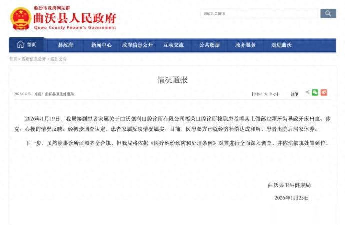 #女子被一次拔牙12颗休克双方和解#【#官方通报女子被一次拔牙12颗休克#:情况属实,医患双方已就经济补偿达成和解,将全面深入调查涉事诊所】1月23日,山西临汾市曲沃县卫生健康局发布情况通报:2026年1月19日,我局接到患者家属关于曲沃德润口腔诊所有限公司福荣口腔诊所拔除患者潘某上颌部12颗牙齿导致牙床出血、休克、心梗的情况反映。经初步调查认定,患者家属反映情况属实。目前,医患双方已就经济补偿达成和解,患者出院后居家休养。下一步,虽然涉事诊所证照齐全合规,但我局将依据《医疗纠纷预防和处理条例》对其进行全面深入调查,并依法依规处置到位。