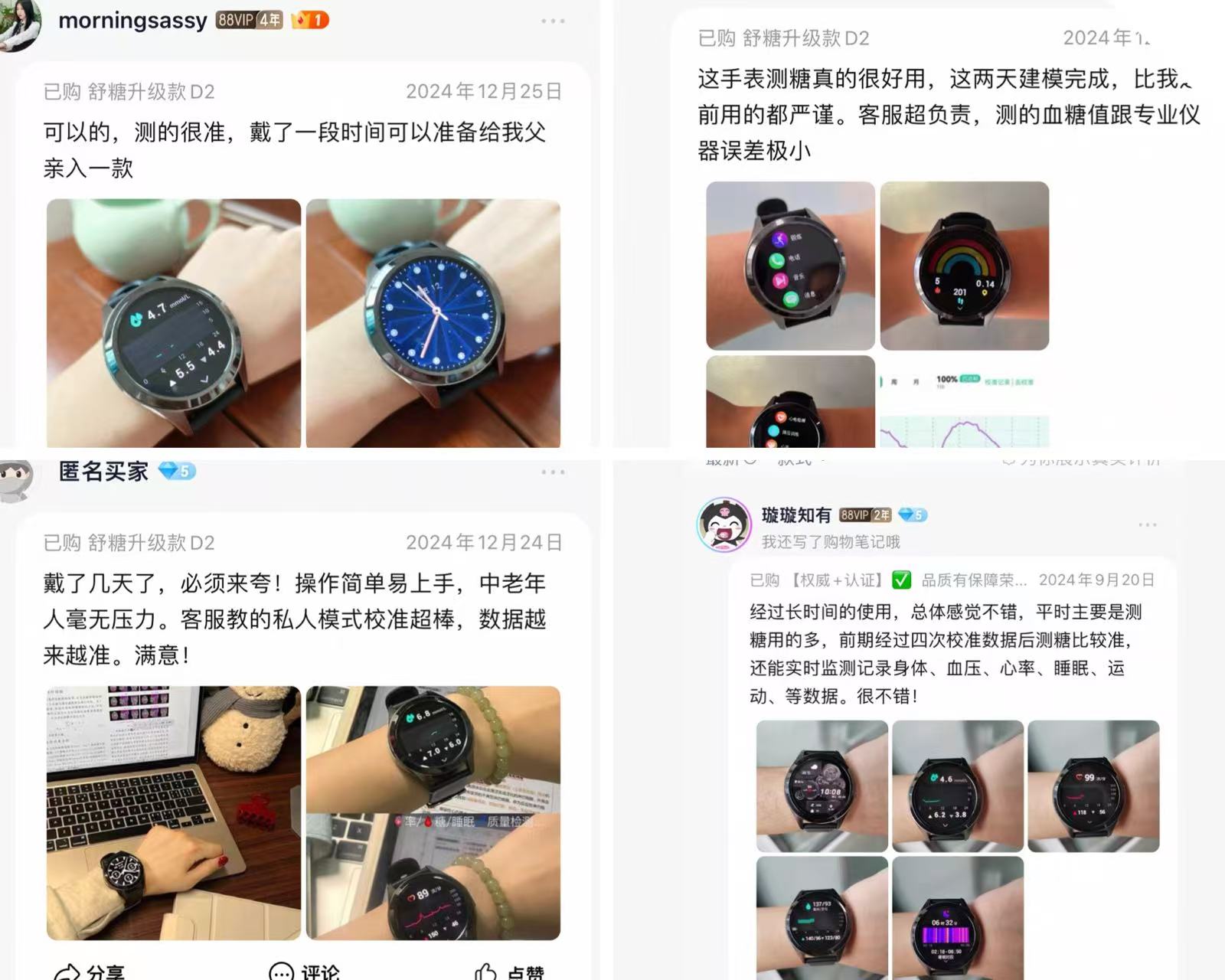 在深圳一位常年被糖尿病困扰的患者,75 岁的李大爷,在采访时高兴地对我们说:“方便!太省心了!用了这款舒糖D2测糖手表,我再也不用每天忍受扎手指的痛苦了,而且随时都能知道自己的血糖水平,感觉生活方便多了。” 像李大爷这样的用户数不胜数,根据对 70 万 + 用户的数据收集和分析,舒糖手表在 94% 的情况下能够准确反映实验室测量血糖的结果。