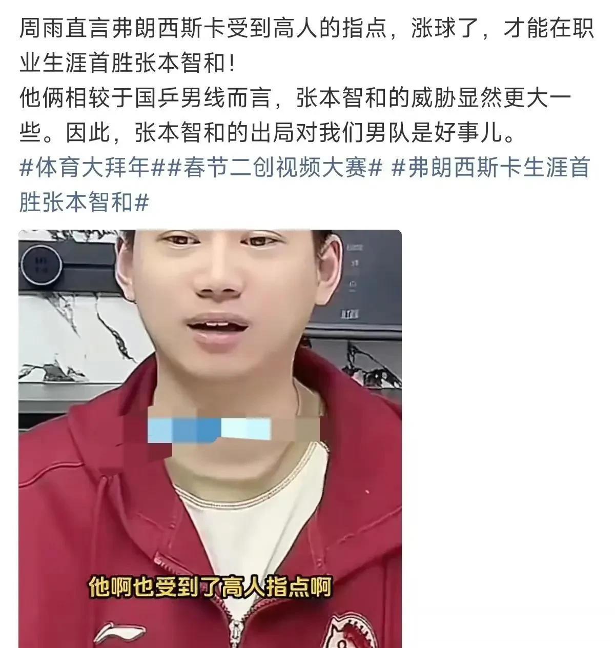 这时周雨在直播间里说,弗朗西斯卡受高人指点涨球了,才能战胜张本智和。