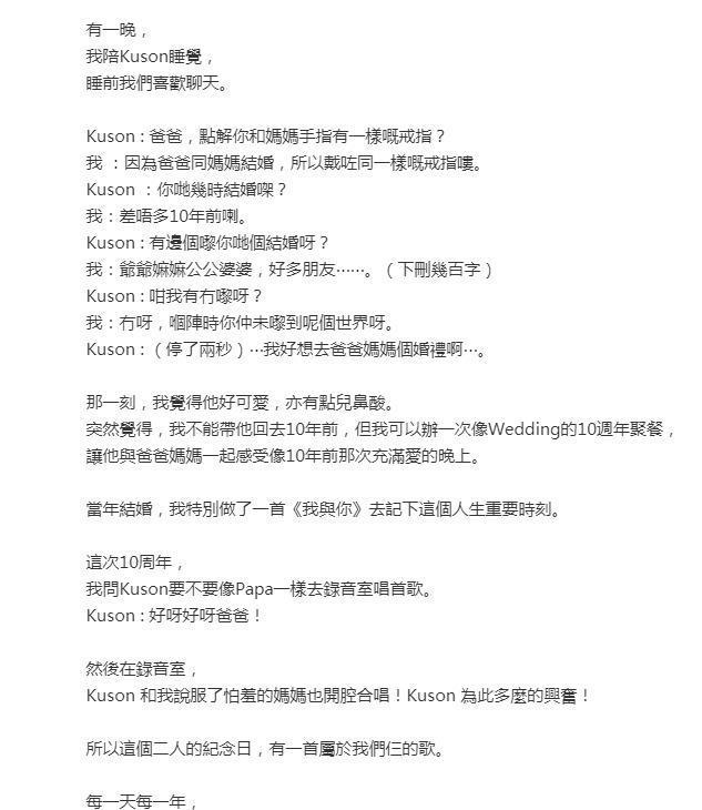 原本,古巨基和妻子陈韵晴打算像往年一样,一家三口低调地度过这个重要的日子。然而,他们可爱的儿子 kuson 的一句话,却让这个计划发生了改变。小 kuson 睁着好奇的大眼睛问:“爸爸,我什么时候结的婚呀?我有没有参加你们的婚礼呢?” 这句天真无邪的话语,深深触动了古巨基夫妇的心。为了满足儿子的心愿,他们决定举办一场盛大而隆重的结婚十周年派对,让儿子也能感受到当年那个充满爱的夜晚。