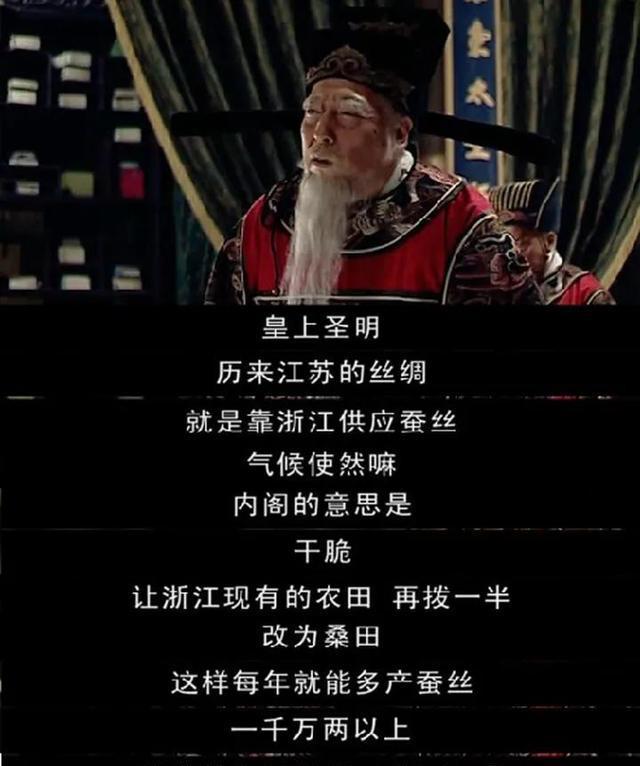 严嵩随即回应:“陛下英明。自古以来,应天的丝绸生产多依赖于浙江提供的蚕丝。这是由气候条件决定的,浙江适宜桑树种植与蚕茧生产。内阁商议后认为,可将浙江现有的农田半数转作桑田,这样一来,每年蚕丝产量预计能增加至少一千万两,换言之,丝绸产量将额外提升二十万匹。”