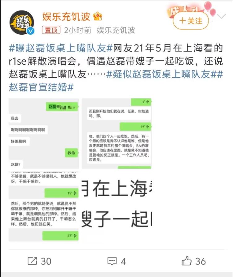 事情发生在2021年5月,据网友透露在上海看r1se解散演唱会时,吃饭偶遇了赵磊在饭桌上吐槽队友。