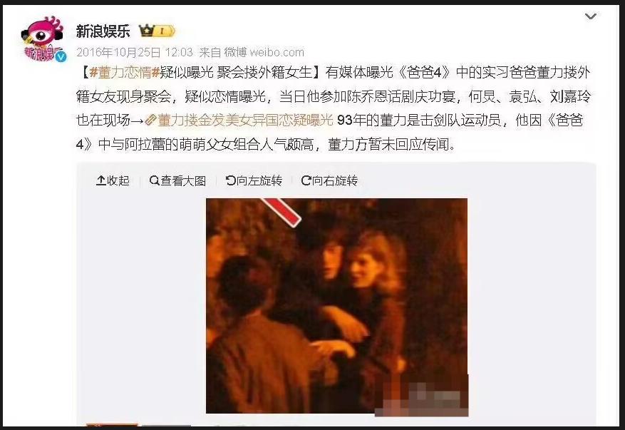 当时,他去参加陈乔恩话剧的庆功宴,董力与外籍女子搂抱的画面遭拍摄,恋情疑似就此曝光。