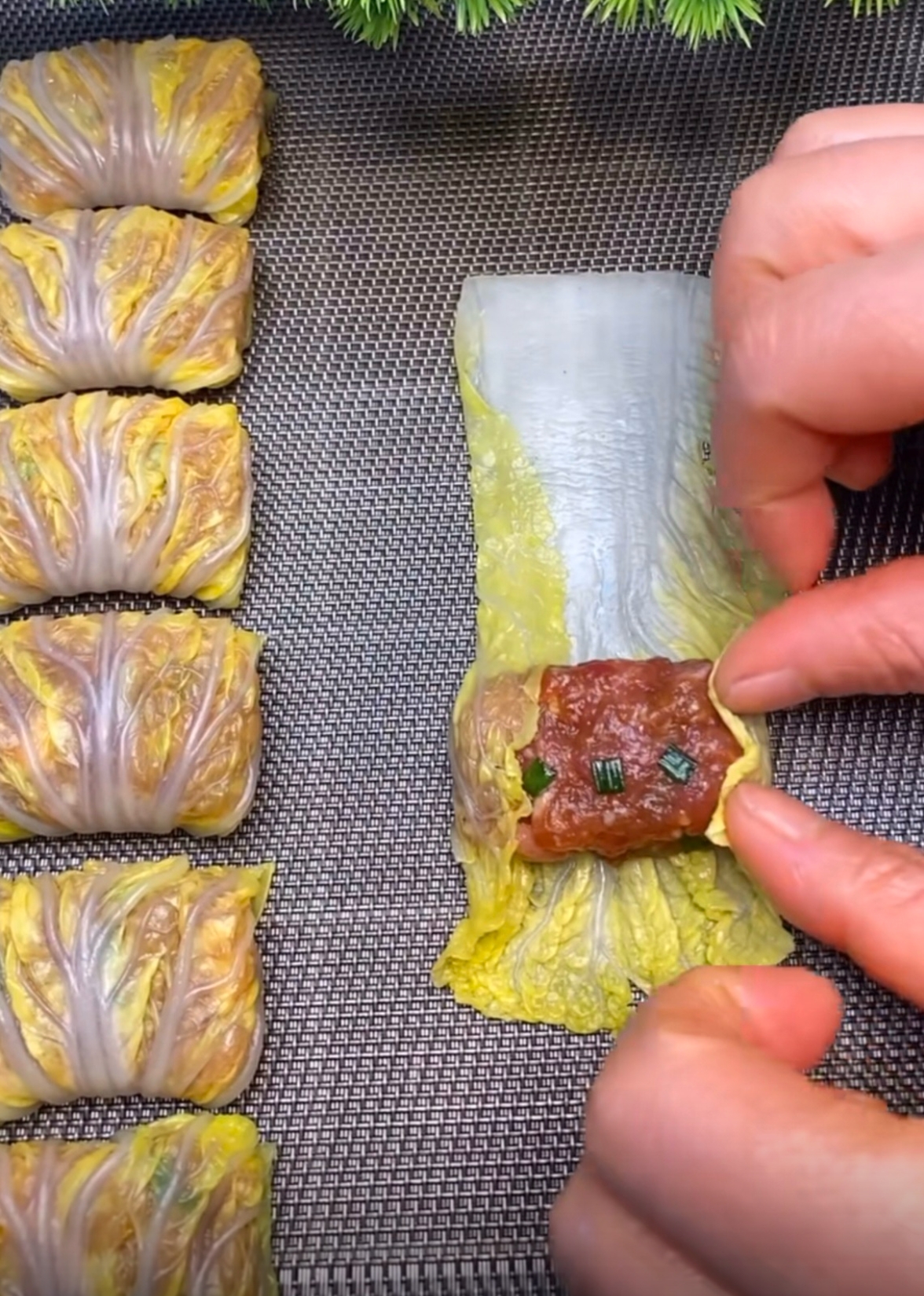 5. 蒸制:将卷好的白菜卷整齐地码放在盘中。蒸锅水烧开后,放入白菜卷,大火蒸12-15分钟。
