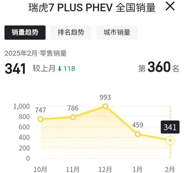 奇瑞瑞虎7 PLUS PHEV在2月份卖出了341台车,跟1月份的459台比起来,少了不少,具体是下滑了25.7个百分点。