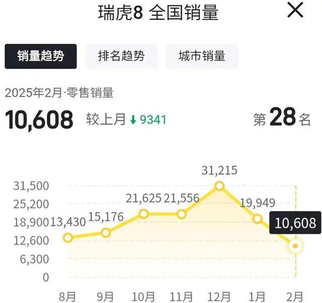 说到具体卖的车子,2025年2月,奇瑞瑞虎8卖出了10608台。跟今年1月比起来,那可是少了不少,1月它还卖了19949台呢,2月直接掉了46.8%。而且啊,从今年1月开始,奇瑞瑞虎8的销量就连着两个月一直在跌。