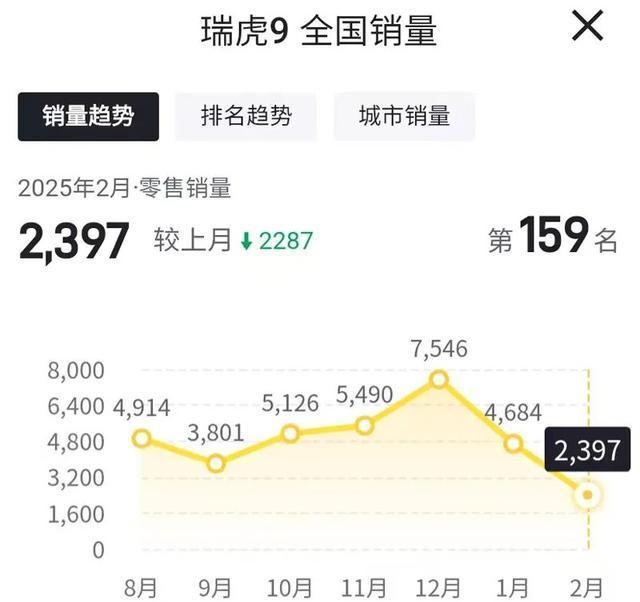奇瑞瑞虎9这款车,在2月份卖出了2397台,跟1月份的4684台比起来,少了不少,降幅达到了48.82%。
