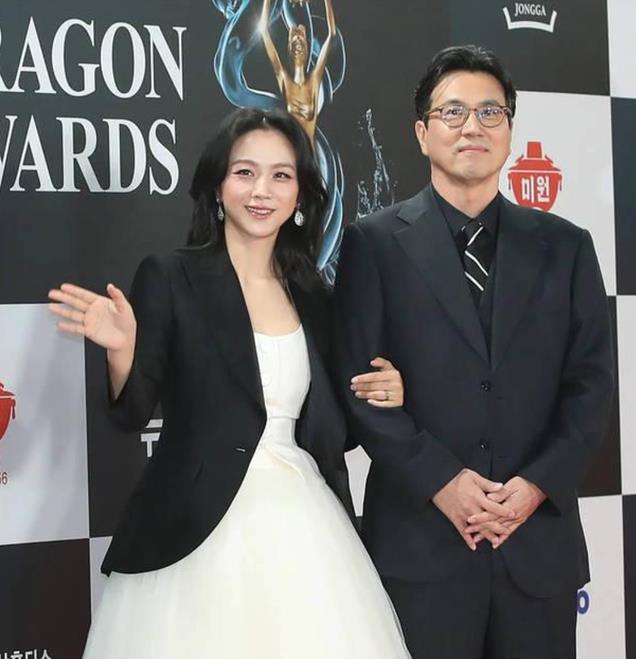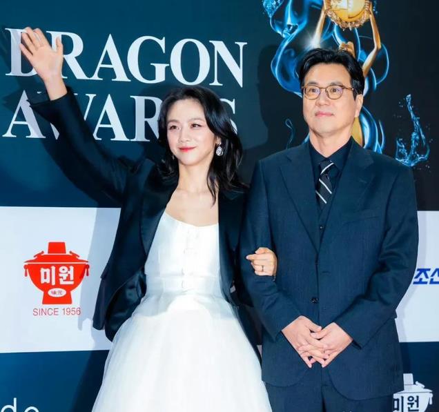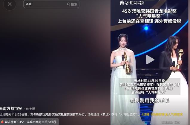 本次颁奖她也是获得了《梦境》这部剧的人气奖。在面对镜头采访时,金泰勇总是有意的后退让汤唯来回答问题,无疑是向在场的众人强调这次的主角是自己的妻子。