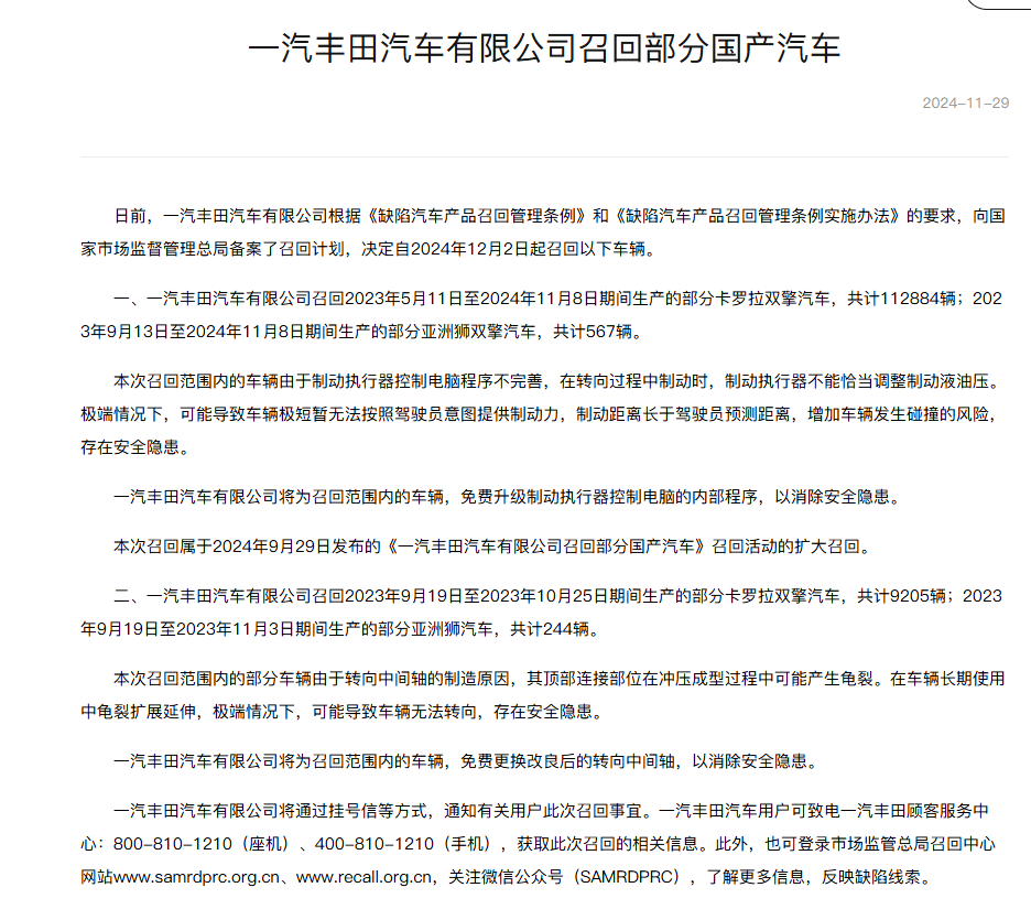 要知道这不是一汽丰田近年来第一次因为生产制造问题召回车辆,在2024年11月29日,一汽丰田就发布公告,因“车辆制动执行器控制电脑程序不完善,在转向过程中制动时,制动执行器不能恰当调整制动液油压。极端情况下,可能导致车辆极短暂无法按照驾驶员意图提供制动力,制动距离长于驾驶员预测距离,增加车辆发生碰撞的风险。”召回113451辆卡罗拉双擎和亚洲狮双擎。