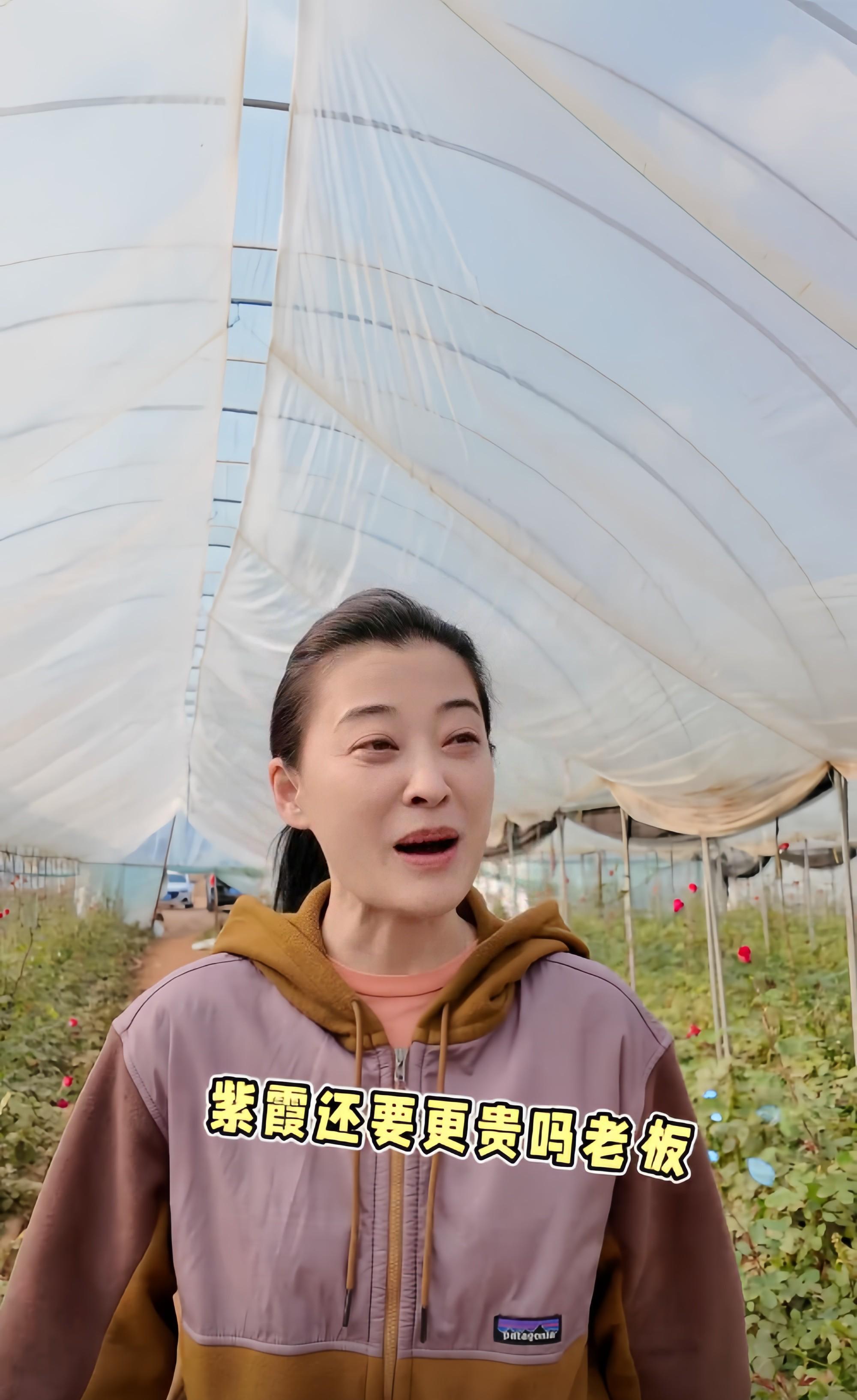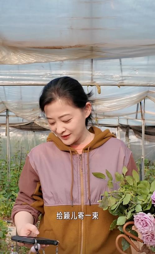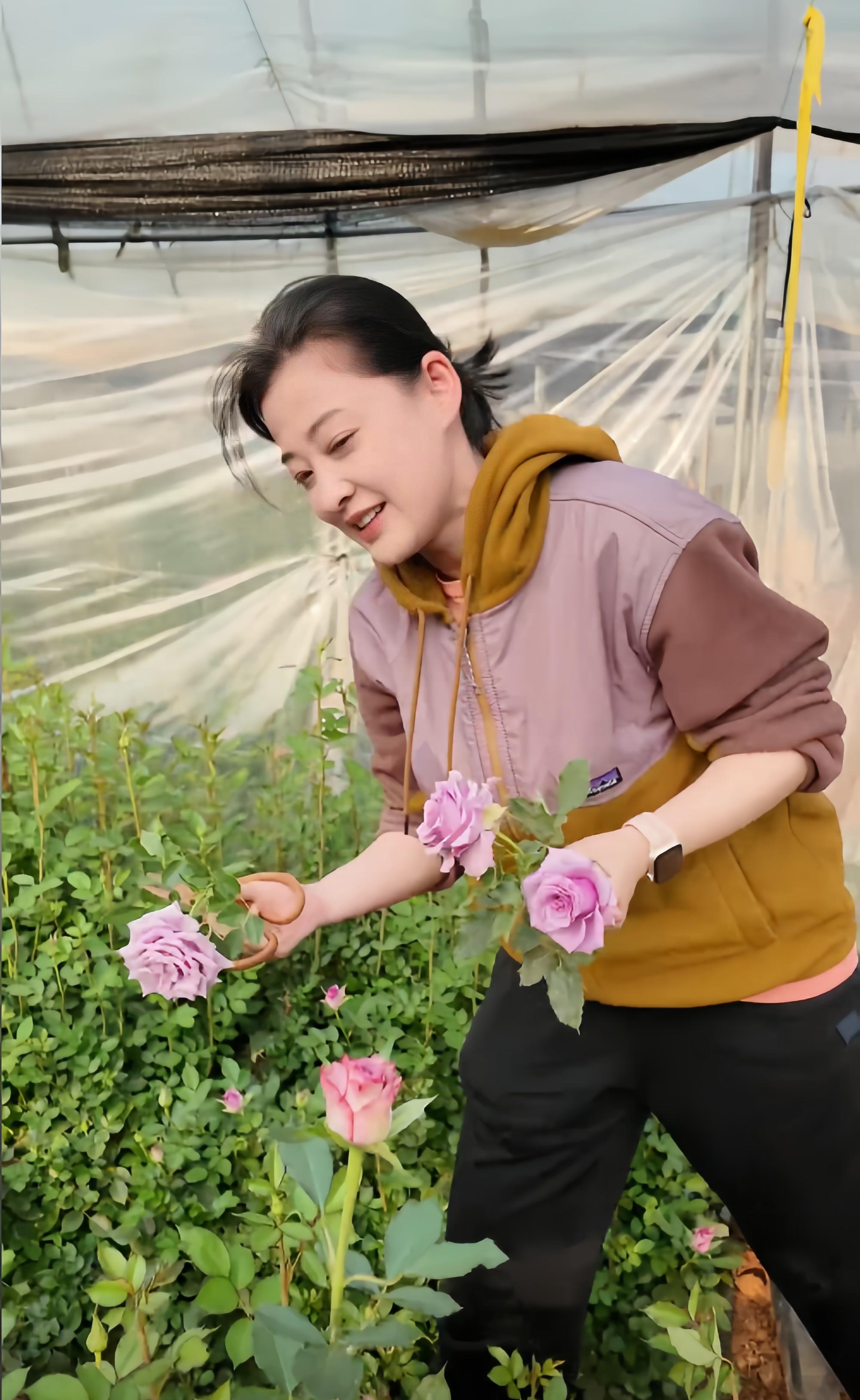 她兴奋地拿起手机,记录下这美丽的景色,并分享自己在大棚里亲自采摘鲜花的喜悦。