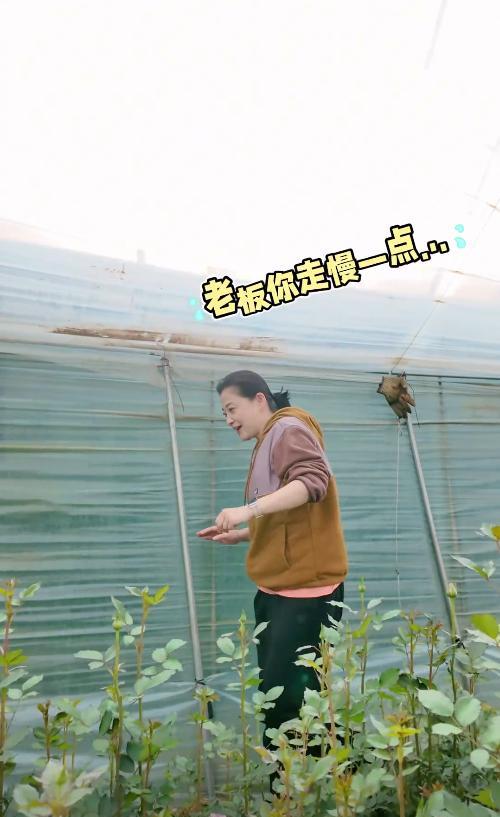在大棚里,梅婷略显笨拙,一只手扶着塑料布,一只手保持平衡,努力地追赶着卖花的老板。