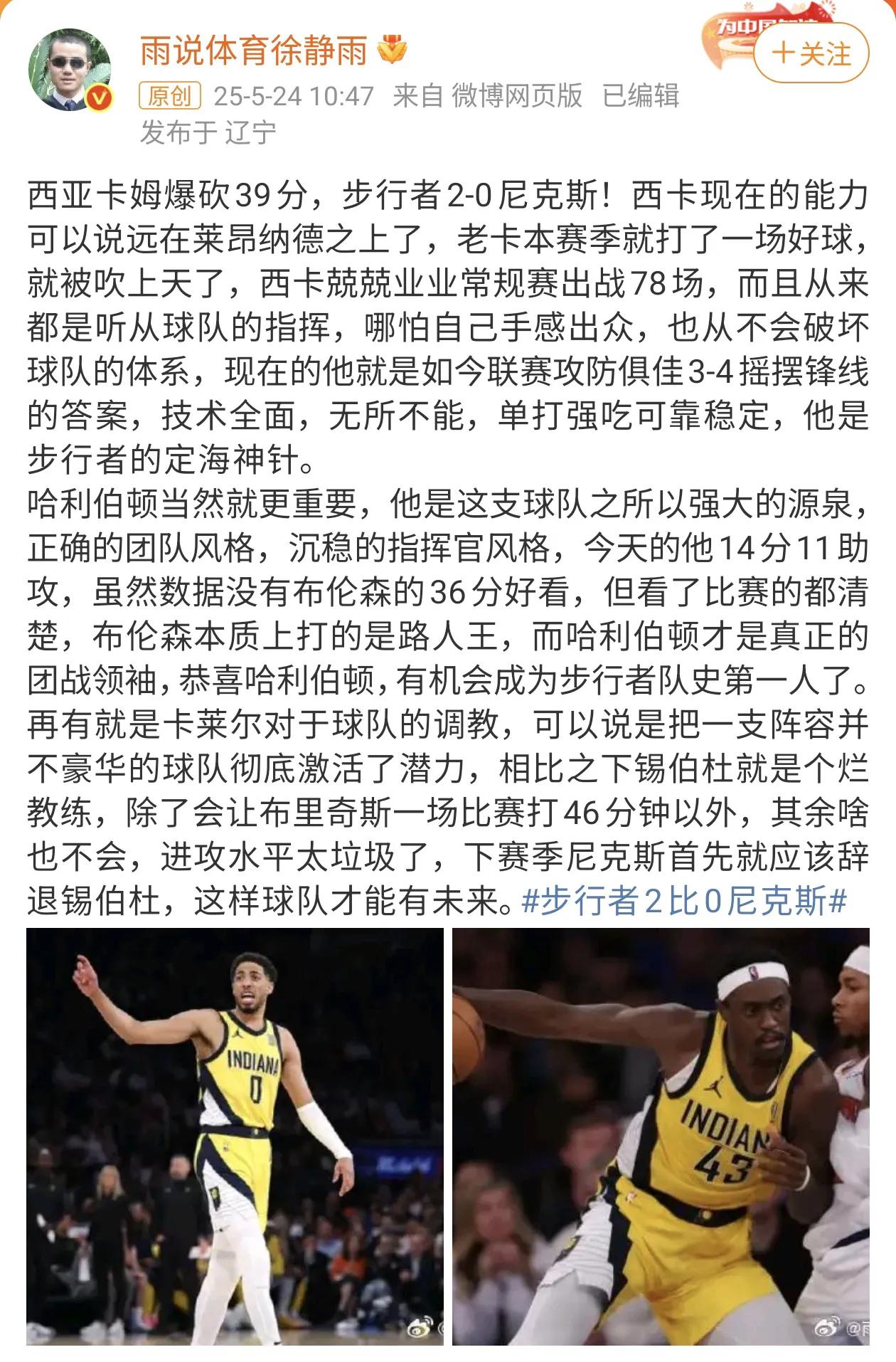名嘴徐静雨则发博,狂吹得到39分的西亚卡姆,更是说他的能力远在小卡之上,就不要太离谱,说哈里伯顿是指挥官,布伦森本质上是路人王…唯一比较认可的就是,徐静雨吹捧卡莱尔,贬低锡伯杜,卡莱尔在率队赢下这一场季后赛后,生涯季后赛胜场数来到了81场,跻身NBA历史前十。