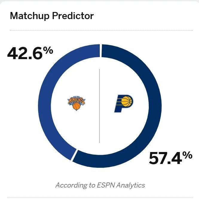 据ESPN实时预测的东决G3胜率,其中步行者57.4%,尼克斯则为42.6%。最后,你认为尼克斯能在步行者主场至少扳回一城吗?欢迎在评论区留言讨论,说出你的理由。