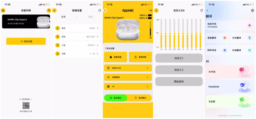 APP调节与AI使用南卡Clip Super2的最大亮点是这次搭载的AI功能,它集成了讯飞和DeepSeek等多模态AI引擎,支持语音翻译、AI对话、图像生成、深度搜索等数十项AI功能1,使耳机从单纯的音频播放设备转变为智能交互终端。翻译功能尤其实用,支持12种语言的实时互译(普通话、粤语、英语、法语、德语、日语、韩语、俄语、越南语、西班牙语、意大利语、阿拉伯语),覆盖全球95%的语言交流场景.实测这个功能相当好用,同声传译:看外语新闻、听讲座时,外语内容几乎实时转成中文传入耳中,延迟很低。对话翻译:与外国人交流时,可以分一只耳机给对方,各自说自己的语言,耳机自动翻译,比拿着手机对吼优雅多了5。
