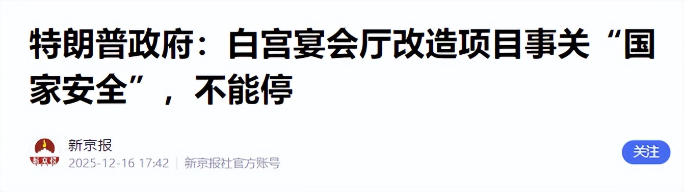 新京报——特朗普政府:白宫宴会厅改造项目事关“国家安全”,不能停