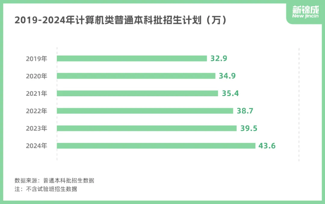 仅2018年到2023年,计算机类专业的计划招生人数就从28万余人增长到39万余人,增长幅度达到38.5%。虽然2023届计算机类专业毕业生就业质量已出现下滑趋势,但计算机类专业招生计划仍在增长。2024年,全国本科计算机类专业招生计划达43万余人,比2023年增加超4万人,增幅超10%。