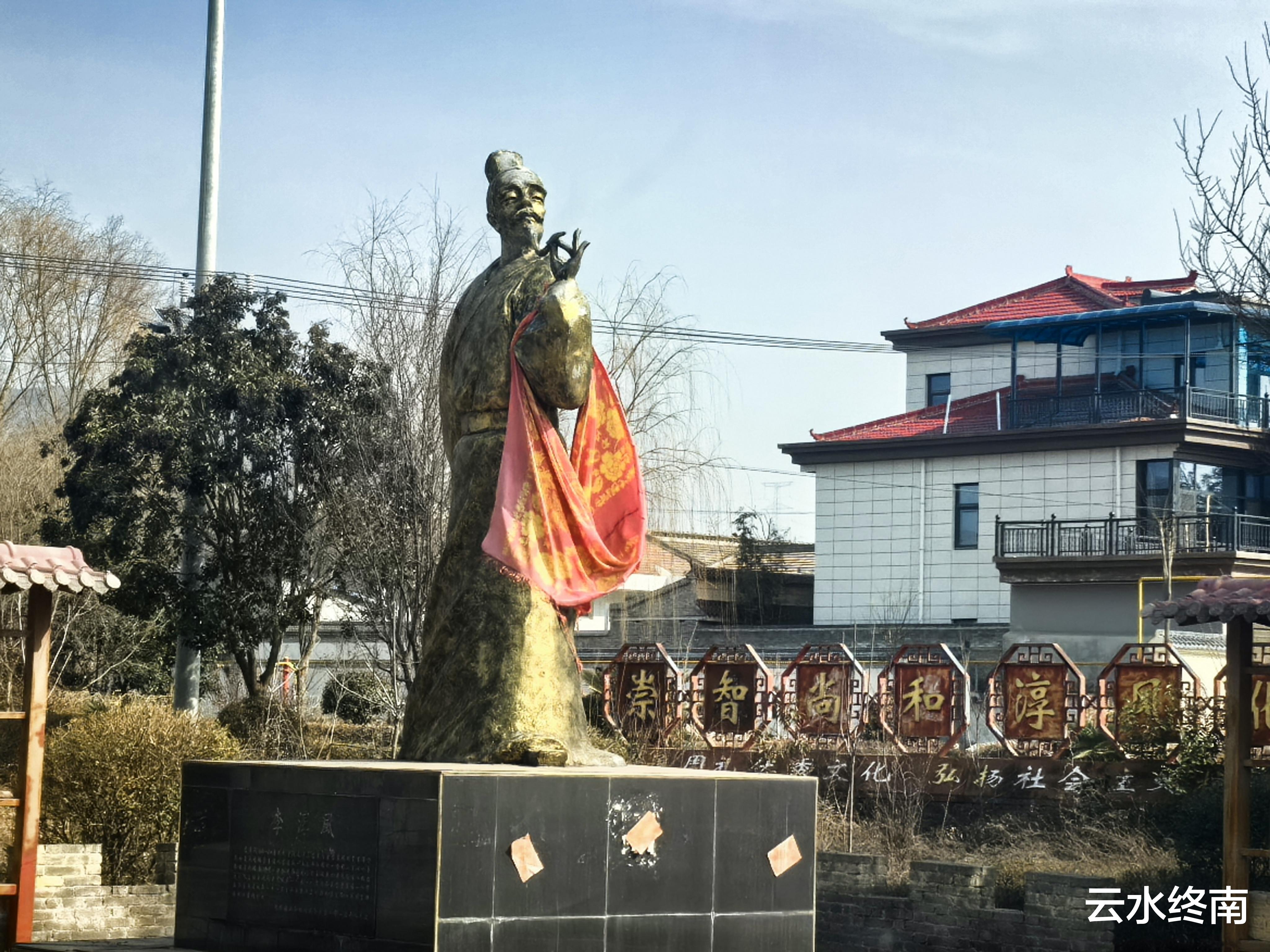 路边有个雕塑,一个瘦削的用手托起仰头的胡子看天,这就是“半仙”李淳风。