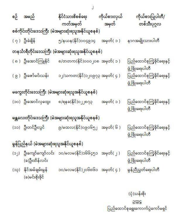 公告称,相关省邦选举委员会分会依据《国家议会选举法》第49条(B)款规定,确认上述人员当选民族议院议员。