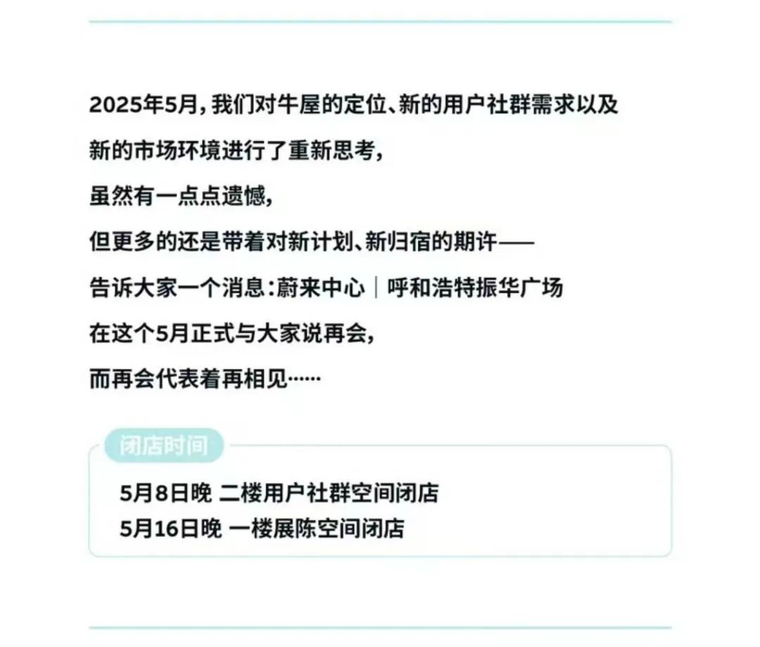 近日呼和浩特“牛屋”官宣闭店,令不少当地蔚来车主感到惋惜。当然,闭店也有可能是自身经营层面以外的因素,例如商场拒绝续租等,但对于呼和浩特蔚来汽车销售服务公司这个“CBU”来说,确实砍掉了一大笔开支。
