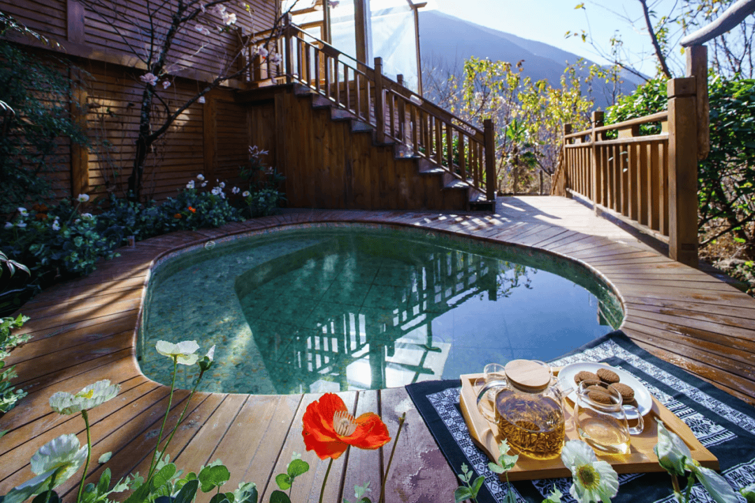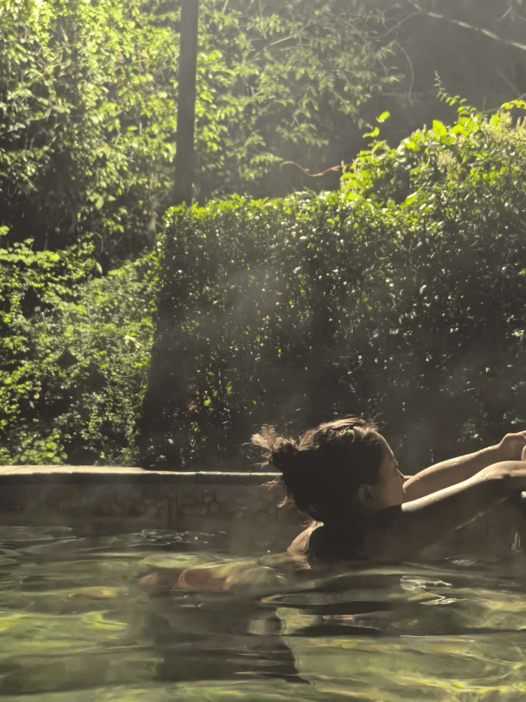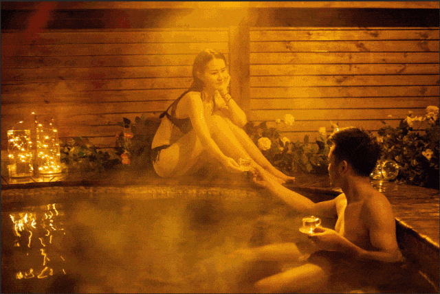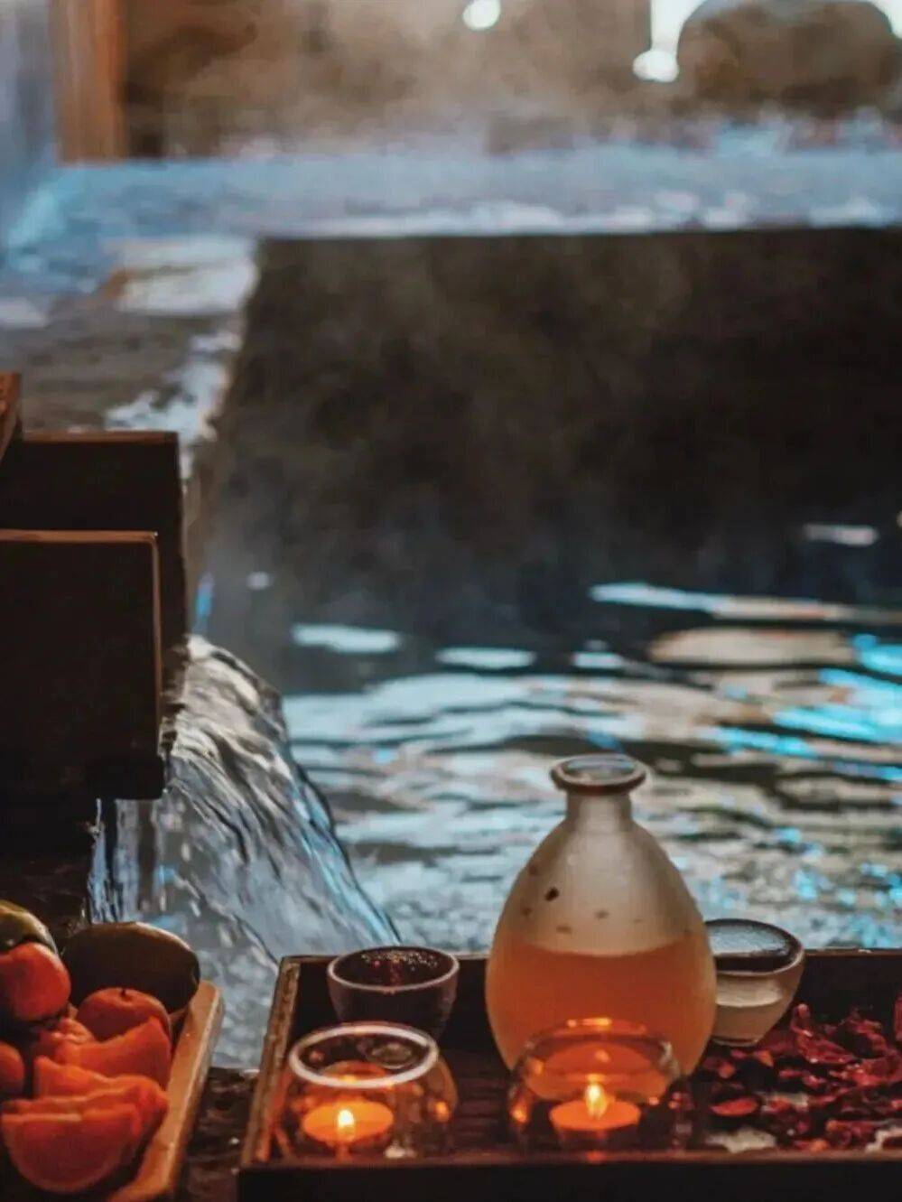 这里的温泉水是天然的地热资源,水温刚好在42℃左右,富含矿物质。泡在里面,毛孔都舒展开来,刚才庖汤带来的饱腹感,在温泉的暖意里变成了惬意的慵懒。