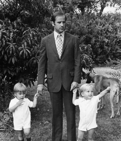 这是1972年拜登的全家福,当时他只有33岁,是最年轻的州议员,前途不可限量,第一任妻子娜莉亚为他生了三个可爱的孩子:博、亨特、内奥米。