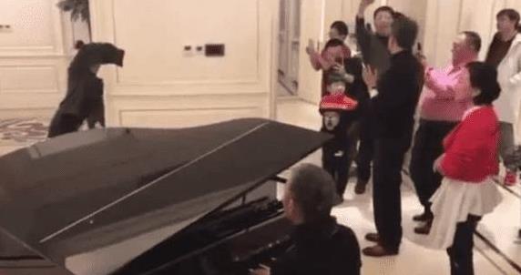 这时候,陈道明冒了出来,他觉得这事儿有点不妥当;毕竟苗苗是个演员,穿着高跟鞋,在这样的场合跳舞就不太靠谱,于是他帮忙打圆场,语气还挺激动地说:“你个大傻瓜,没见过人往那儿扭啊!”虽然陈老在旁边拼命拉人,但苗苗还是硬是把高跟鞋脱了,给大家来了一段舞蹈;陈老无奈,只好坐上钢琴边给她打着伴奏,居然还是《绒花》那调儿!