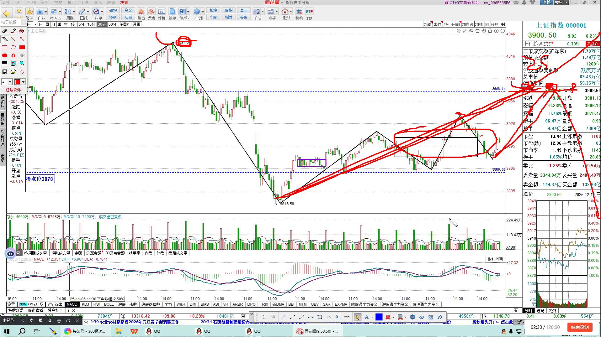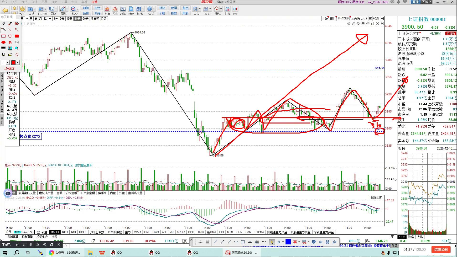 如果直接这样画简单一点,这里又形成了底分型,就认为这里是在构建更大结构的上涨中枢。如果上涨中枢下边下沿理论上是不能再被跌破了,就是三千八百五十九点。