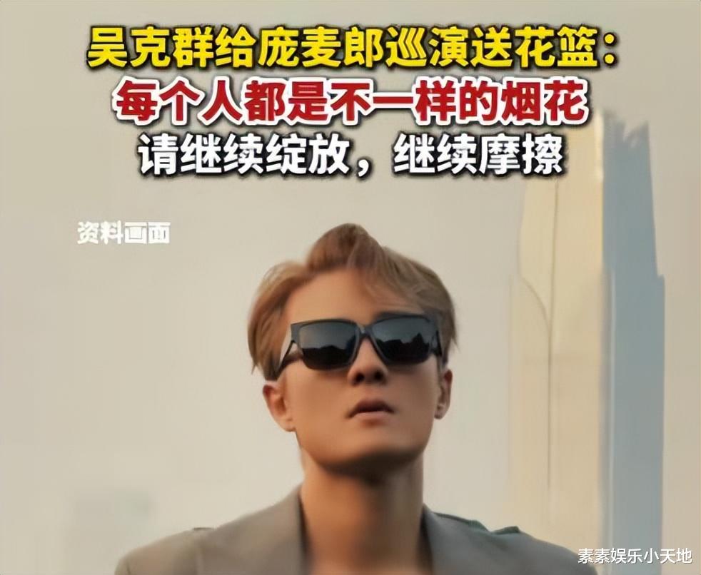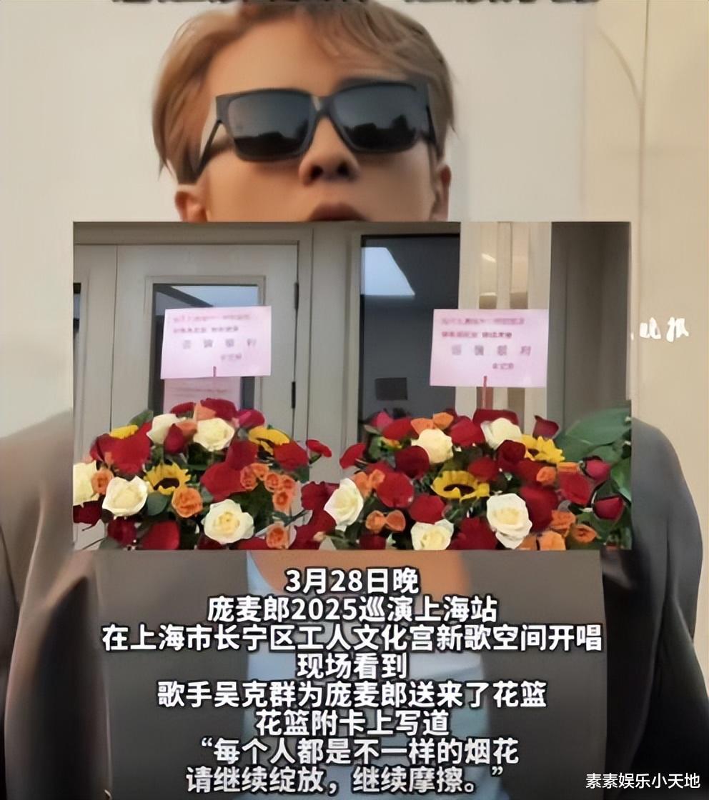 在上海长宁区的工人文化宫,吴克群为庞麦郎送上了花篮,支持他的演唱会,鼓励他继续绽放。